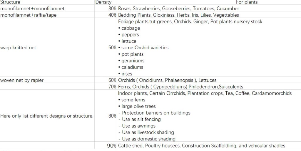 Plant shade cloth has different colors and percentages. The percentage listed is a light diffusion percentage. The amount of light diffusion necessary is based on the type of plant and the climate that you are growing in.We supply 30% to 90% shade cloth in monomono filament or raffia ,also as tape.